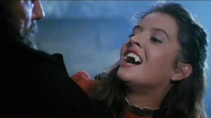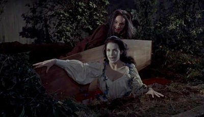 With The Vampire Lovers (1970), Hammer explored a theme that would become popular in European horror films: lesbian vampires. This is part of their Karnstein trilogy of three films based on the story of Carmilla Karnstein from the 1871 gothic novella Carmilla. This film includes another Hammer twist on the vampire legend as Carmilla morphs into a large cat to seduce her sleeping victim. The film has Hammer’s usual well done sets, lighting, and color photography and was shamelessly high on titillation: Carmilla, played by Polish actress Ingrid Pitt, prefers girls. Pitt had no problem with the nude scenes but Madeleine Smith, who played the doe-eyed innocent virgin, was uncomfortable and later said she wished she hadn’t done them.