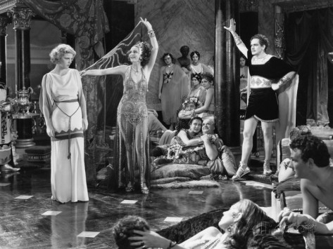 Movies about classic antiquity gave filmmakers an opportunity for exotic locations, elaborate sets, and scantily clad women. Cecil B. DeMille was the most famous director in the world and he was always up against censors for violent and disturbing scenes as well as for the revealing wardrobes. In Sign of the Cross, the games at the Coliseum are brutally depicted: Christians vs. lions, alligators, bears, apes, elephants, and mechanical devices. Claudette Colbert’s milk bath almost covers her breasts and Rome’s most promiscuous femme tries to tempt the chaste Christian girl with a lesbian seduction dance.